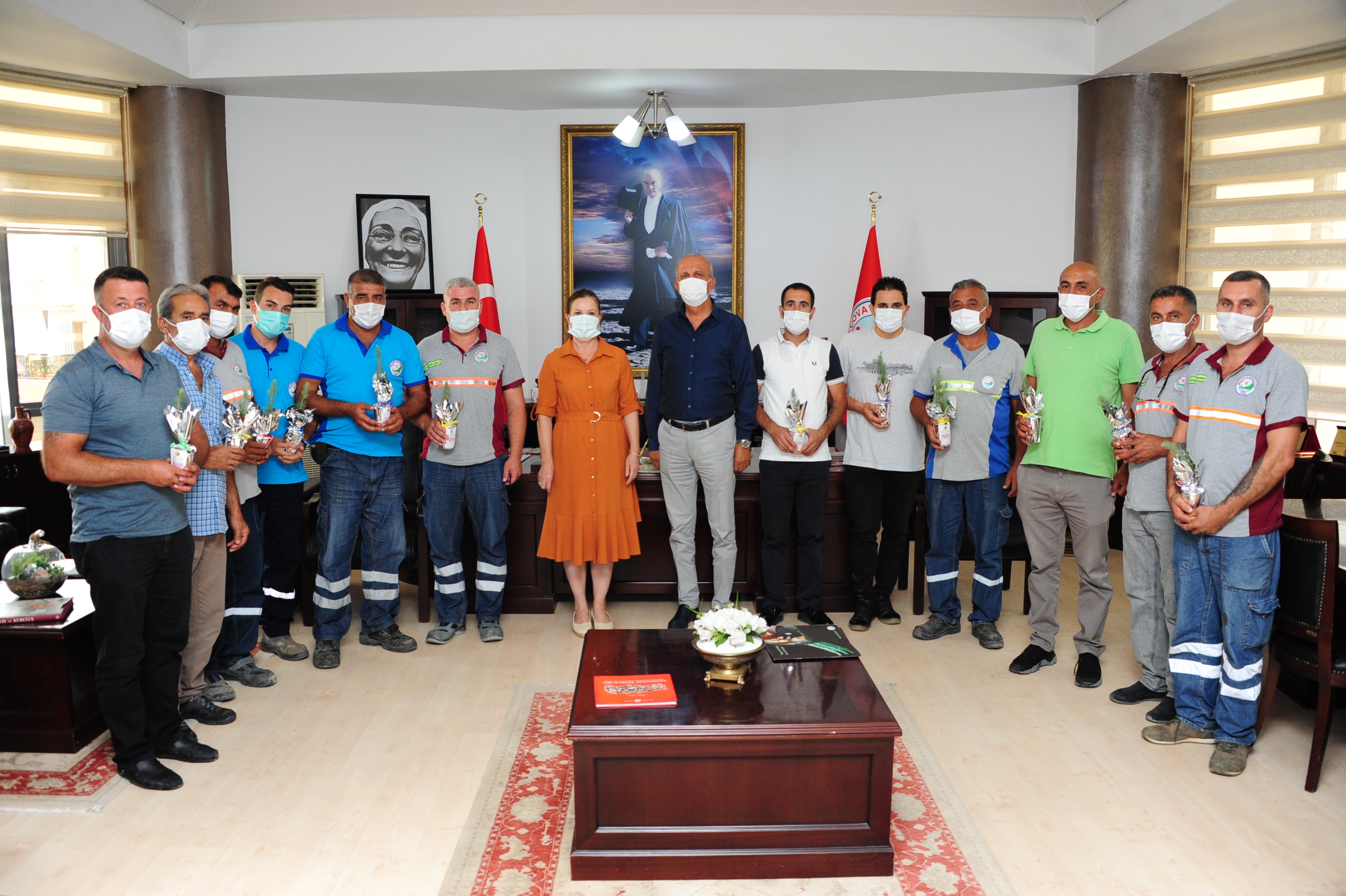 Gece gündüz demeden dağ başlarında alevlerle mücadele eden personeli ile bir araya gelen Balçova Belediye Başkanı Fatma Çalkaya da personeline birer çam fidanı hediye etti.