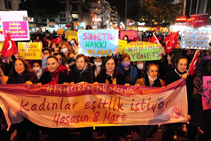Caddeleri dolduran binlerce kadın bir yandan 'Toplumsal Cinsiyet Eşitliği'ni savunan sloganlar atarak pankartlar taşıdı diğer yandan da "Geceler de bizim gündüzler de bizim" diyerek halaylar çekti.