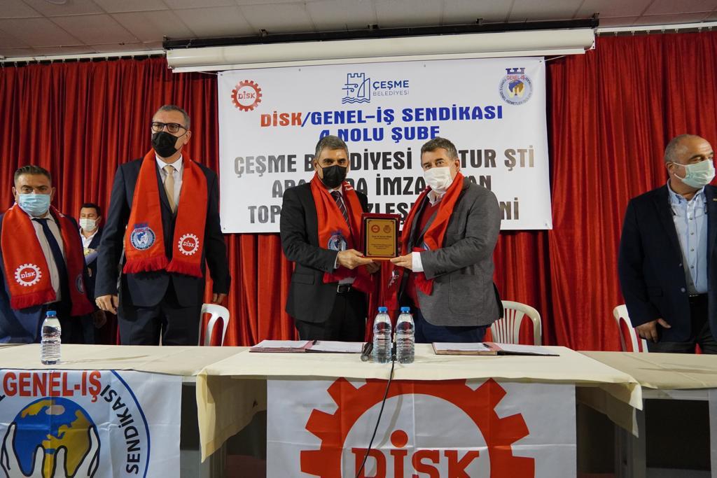Çeşme Belediyesi ve DİSK/Genel-İş Sendikası 4 Nolu Şubesi arasında belediyede görev yapan 330 personeli kapsayan Toplu İş Sözleşmesi imzalandı. Çakabey Kültür Merkezi’nde Toplu İş Sözleşme töreni gerçekleştirildi. Çeşme Belediye Başkanı M. Ekrem Oran ve DİSK / Genel İş Sendikası Genel Başkanı Remzi Çalışkan arasında imzalanan 2 yıl süreli sözleşmeyle işçilerin taban ücretlerine zam yapıldı.