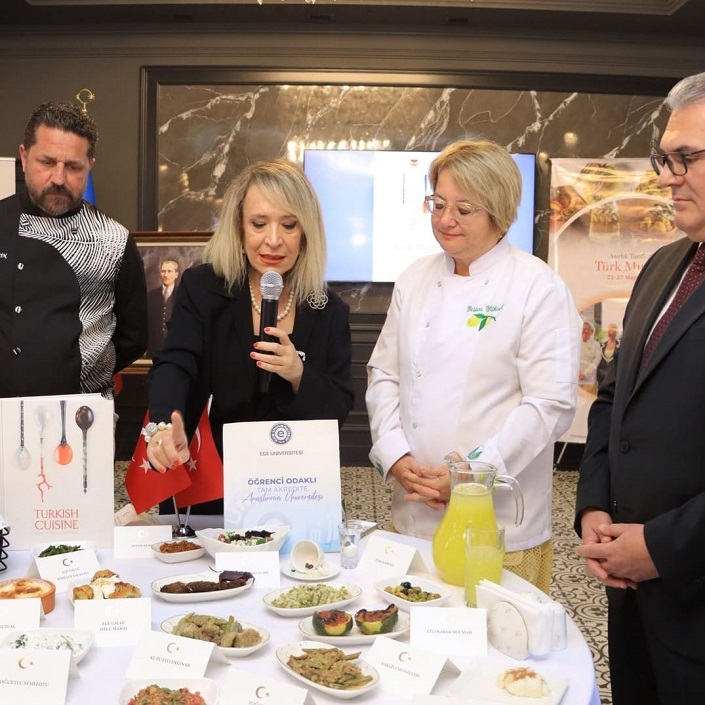 İletişim Fakültesi ve Çeşme Turizm Fakültesi Dekanı Prof. Dr. Bilgehan Gültekin, “Kültür ve Turizm Bakanlığı tarafından Türkiye'nin yurt içindeki ve yurt dışındaki tüm diplomatik temsilciliklerinde kutlanan, Türk Mutfağı Haftası'nın Can Azerbaycan Gence Başkonsolosluğu etkinliği, Ege Üniversitesi İletişim Fakültesi ve Çeşme Turizm Fakültesi tarafından hazırlandı. Asırlık tariflerle hazırladığımız bölgemiz mutfağının sevilen lezzetlerini hem başkent Bakü’de hem de kadim şehir Gence’de tanıtmanın gururunu yaşadık. Kullanılan tüm malzemeleri İzmir’imizden naklettirdik. Türk gastronomisinde zengin içeriği ile dikkat çeken bölgemiz mutfağının birbirinden lezzetli tariflerini hem sergiledik hem de konuklara ikram ettik. Ekibimiz, tam akredite, öğrenci odaklı, araştırma üniversitemizi başarıyla temsil ettiler. Yaptıkları birbirinden leziz yemeklerle etkinliğe damga vurdular. Nazik ev sahipliği için Gence Başkonsolosumuz Recep Öztop’a teşekkür ediyorum. Türk turizmine nitelikli katkı sunacağına inandığım bu önemli ve anlamlı organizasyonda görev alan İletişim Fakültemiz Öğretim Üyesi Prof. Dr. Aylin Göztaş hocamız başkanlığındaki ekibimizi tebrik ediyorum” dedi.