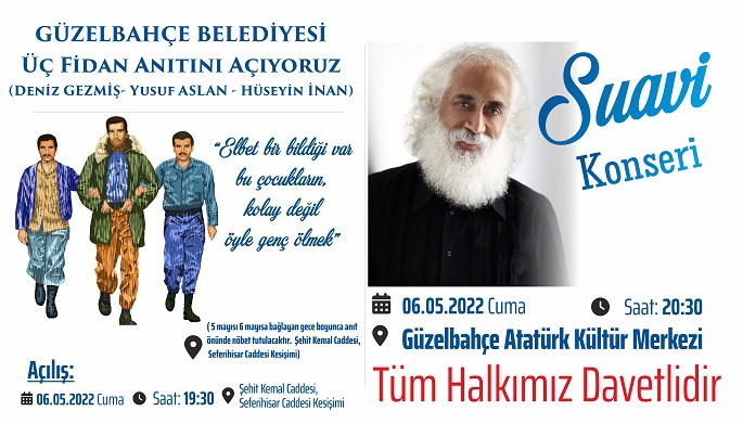 6 Mayıs Cuma saat 19:30’da Üç Fidan anıtı açılışı yapılacak, ardından saat 20:30’da sanatçı Suavi’nin Güzelbahçe Atatürk Kültür Merkezi’nde vereceği konserle son bulacak.