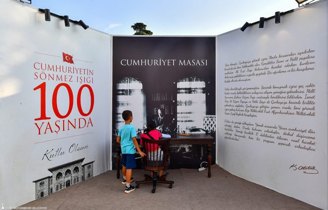 Kültürpark’ın Lozan kapısı girişine kurulan ‘100. Yılda Cumhuriyet Tüneli’ ziyaretçilerden yoğun ilgi gördü. Hexagonal ledli düzenek ile tünel içerisinden geçen ziyaretçiler Cumhuriyet kurgulu prodüksiyonda Mustafa Kemal Atatürk ve silah arkadaşlarının verdiği milli mücadeleden cumhuriyete kadar geçen tüm süreci izledi. İzmir Büyükşehir Belediyesi standında yer alan Cumhuriyet Masasında ise İzmirliler 100. yıl için açılan anı defterini imzaladı.