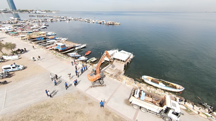 İzmir Emniyet Müdürlüğü ekiplerinin de destek verdiği çalışmada, kepçeler yapıları yıkarak denizden çıkardı. Toplanan atıklar belediye tarafından imha edilecek.
