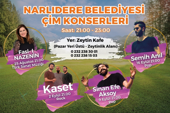 Narlıdere Belediyesi’nin bu yıl ilk kez düzenleyeceği Çim Konserleri, pazar yerinin üst kısmındaki zeytinlik alanda yeni yapılan Zeytin Kafe’nin bahçe alanında 21.00- 23.00 saatleri arasında yapılacak. İlk konser 25 Ağustos Çarşamba günü gerçekleşecek ve Türk Sanat Müziğinin sevilen ismi Fasl-ı Nazenin sahne alacak. 2 Eylül Perşembe günü Kaset grubu rock konseri verecek. 9 Eylül Perşembe günü pop müziğinin sevilen sesi Sinan Efe Aksoy sahne alacak. 16 Eylül’de de Semih Anıl çim konserlerinin kapanışını yapacak.