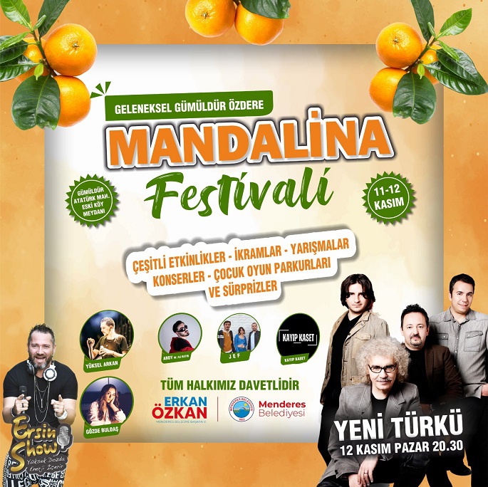 Menderes Belediyesi tarafından Geleneksel Gümüldür-Özdere Mandalina Festivali 11-12 Kasım tarihleri arasında Gümüldür Eski Köy Meydanı’nda yapılacak. 2 gün boyunca mandalinaya dair her şeyin yer alacağı festival renkli görüntülere sahne olacak.