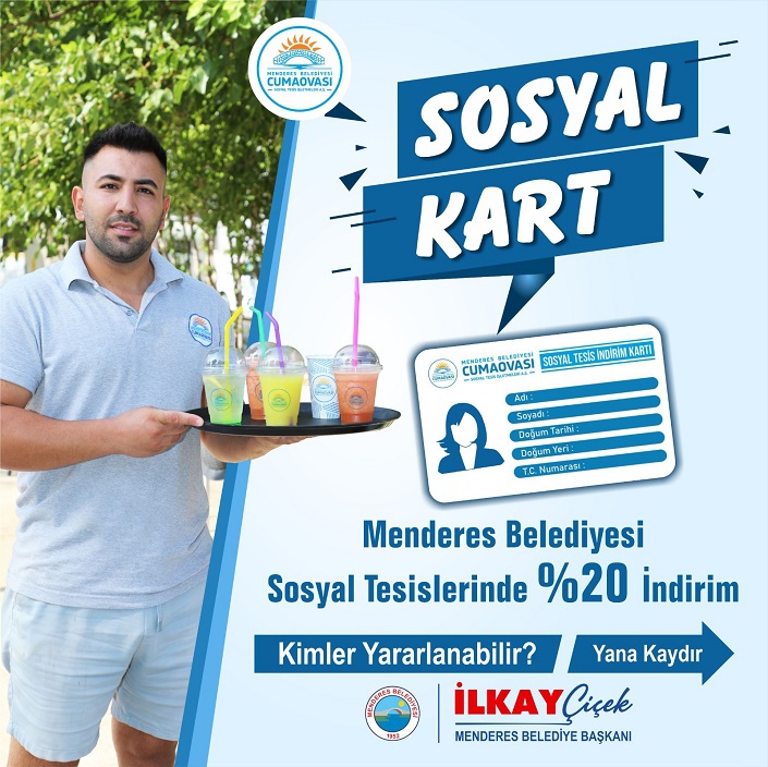 Menderes Belediyesi iştiraki olan Cumaovası A.Ş’ye bağlı 12 tesiste geçerli olacak indirimden 1. derece şehit yakınları, gaziler, engelli vatandaşlar, 65 yaş üstü vatandaşlar ile 15-20 yaş arası gençler yararlanabilecek. Sosyal kart almak isteyenlerin Menderes Belediyesi Kültür ve Sosyal İşler Müdürlüğüne, 1 adet fotoğraf ve ikametgâh belgesi ile başvurmaları gerektiği bilgisi verildi.