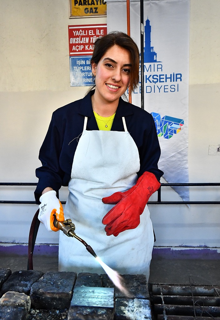 İzmir Büyükşehir Belediyesi Meslek Fabrikası Şube Müdürlüğü, Geleceğini Kuran Genç Kadınlar Projesi kapsamında Karabağlar Atatürk Mesleki ve Teknik Anadolu Lisesi atölyesinde Oksijen Kaynakçılığı Kursu veriyor.