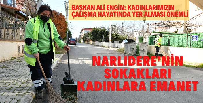 Narlıdere Belediyesi Temizlik İşleri Müdürlüğü’nün bünyesindeki kadın personeller, ellerindeki süpürgelerle sokakları temizliyor.