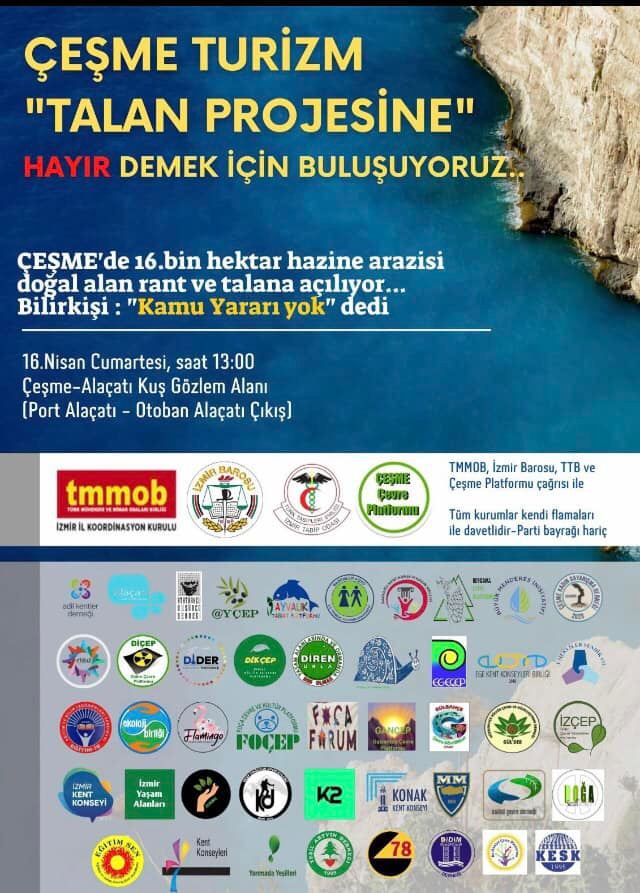 Bu çerçevede 16 Nisan 2022 Cumartesi günü, saat 13:00-14:30 arası Çeşme-Alaçatı’da bir basın açıklaması toplantısı yapılacaktır.