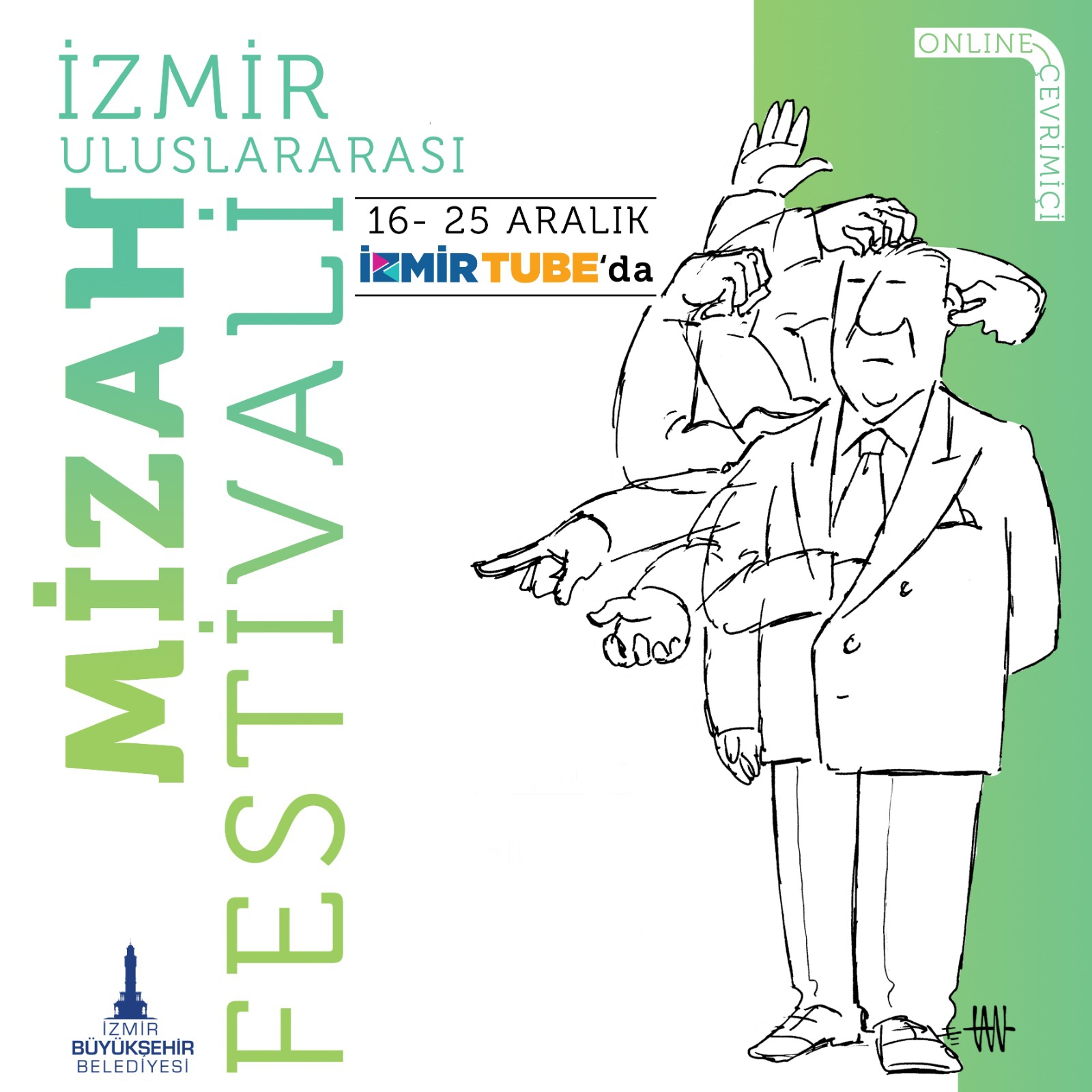 İzmir Büyükşehir Belediyesi’nin düzenlediği ve bu yıl ilk kez uluslararası boyutta yapılacak İzmir Mizah Festivali, 16 Aralık saat 19.00’dan itibaren İzmir Tube üzerinden çevrimiçi olarak yayınlanacak. On gün sürecek ve her akşam aynı saatte yayına girecek festival etkinliklerine sanat dünyasının önemli isimleri katılacak. Mizah ve toplumsal eleştiri temasına odaklanan, Vecdi Sayar’ın danışmanlığındaki festivalde, “Karikatürümüzde Toplumsal Eleştiri ve Mizah”, “Sinemada Mizah”, “Medyada Politik Mizah”, “Müzik ve Mizah”, “Görsel Sanatlar ve Mizah”, “Kısa Filmde Toplumsal Eleştiri ve Mizah”, “Dünya Karikatüründe Toplumsal Eleştiri ve Mizah”, “Edebiyattan Tiyatroya Mizah” başlıklarının ele alınacağı söyleşiler gerçekleşecek.